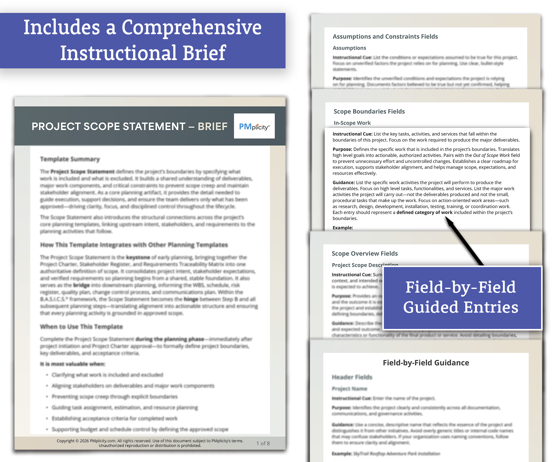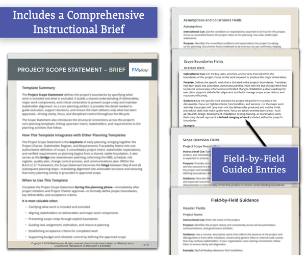The included comprehensive, field‑by‑field Template Brief walks you through each section, ensuring every entry is purposeful, accurate, and aligned with project intent. It establishes the project’s boundaries by specifying included and excluded work, building a shared understanding of deliverables, major work components, and critical constraints. This clarity helps prevent ambiguity and scope creep while strengthening stakeholder alignment and supporting disciplined decision‑making.
