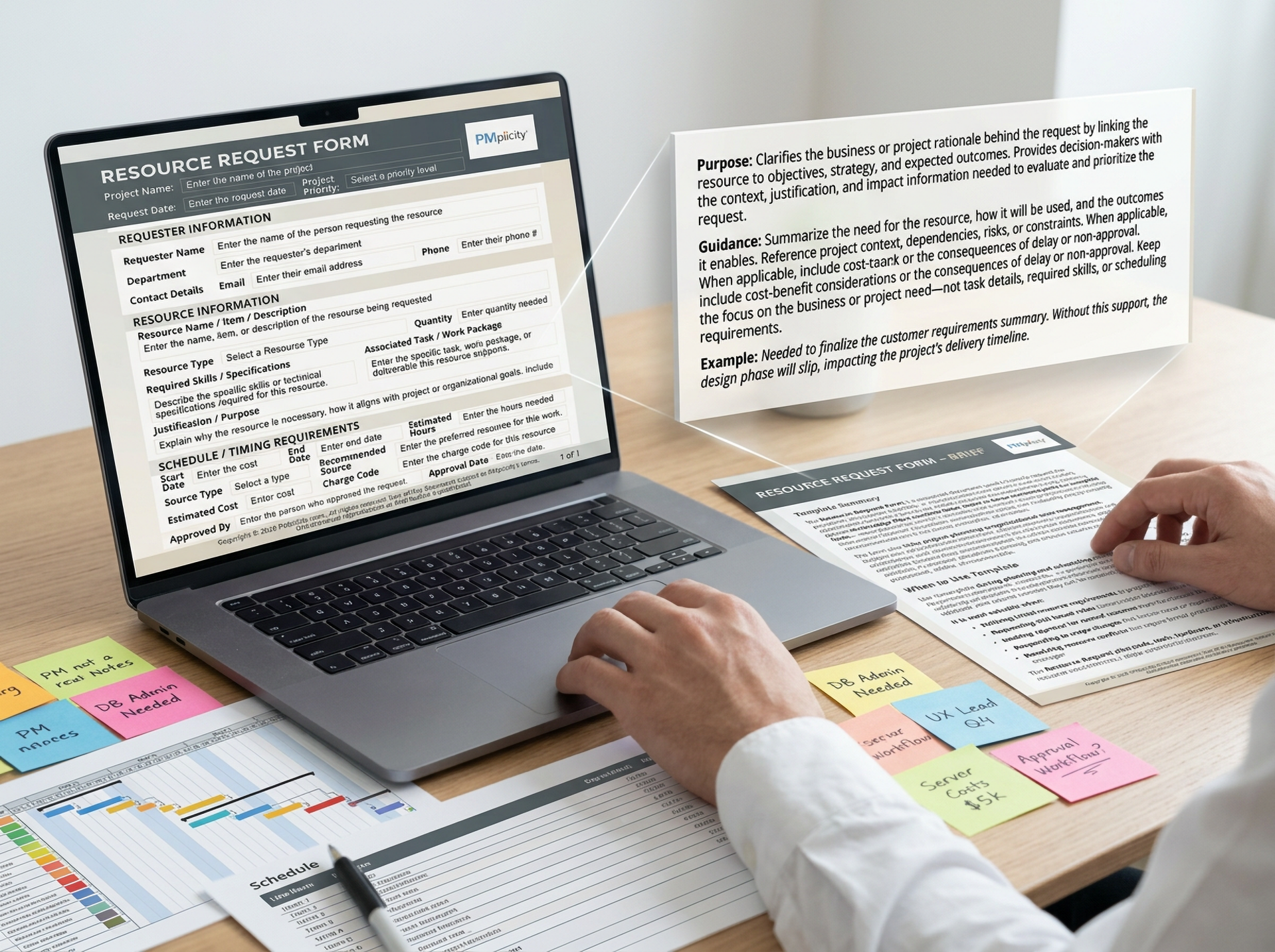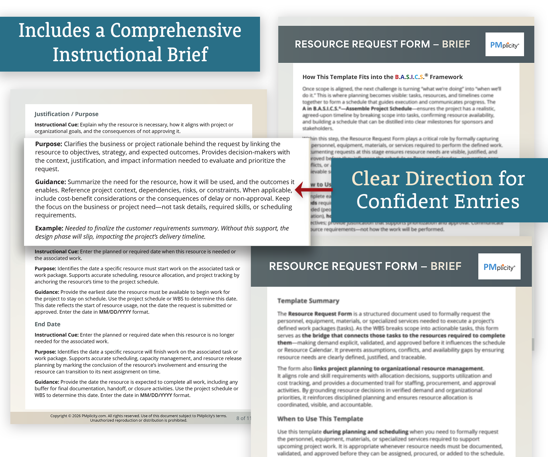A comprehensive, field‑by‑field Template Brief walks you through each section, ensuring every entry is purposeful, accurate, and aligned with project needs. It clarifies what information belongs in each field, why it matters, and how it supports resource validation, justification, scheduling, and approval — enabling confident, approval-ready requests.